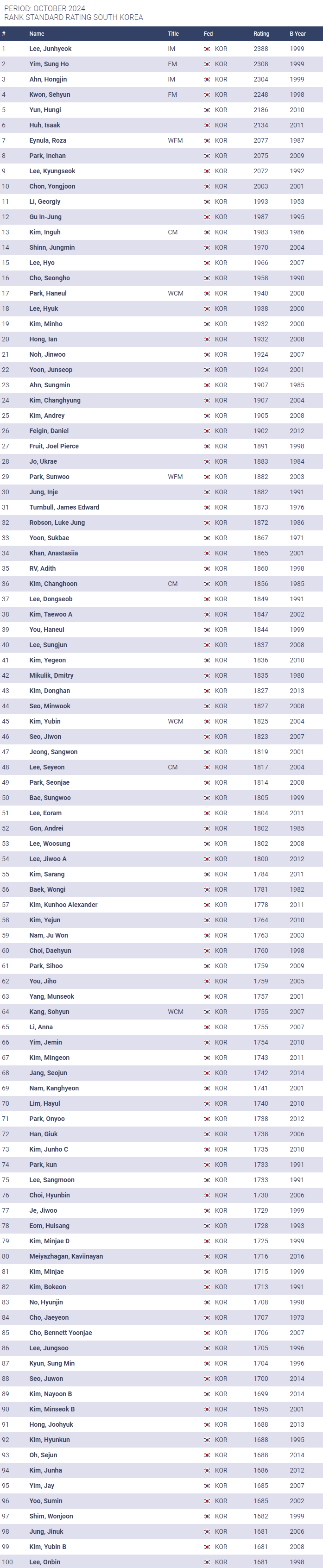 | 2024년 11월 FIDE 레이팅 랭킹 (대한민국) (0) | 2024.11.07 |