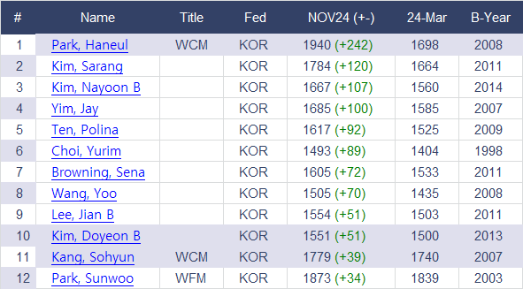 2024년 3월에서 2024년 11월까지 피데 레이팅을 가장 많은 올린 랭킹입니다.