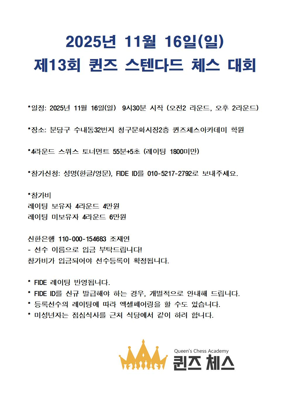| 제31회 LSH FIDE레이팅대회 모집요강 (0) | 2025.10.28 |