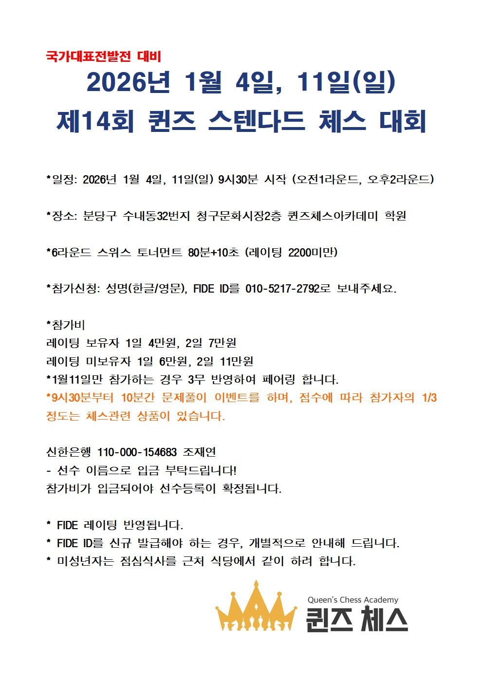 | 제1회 김포시 FIDE 공인 래피드 체스대회 (0) | 2025.12.09 |